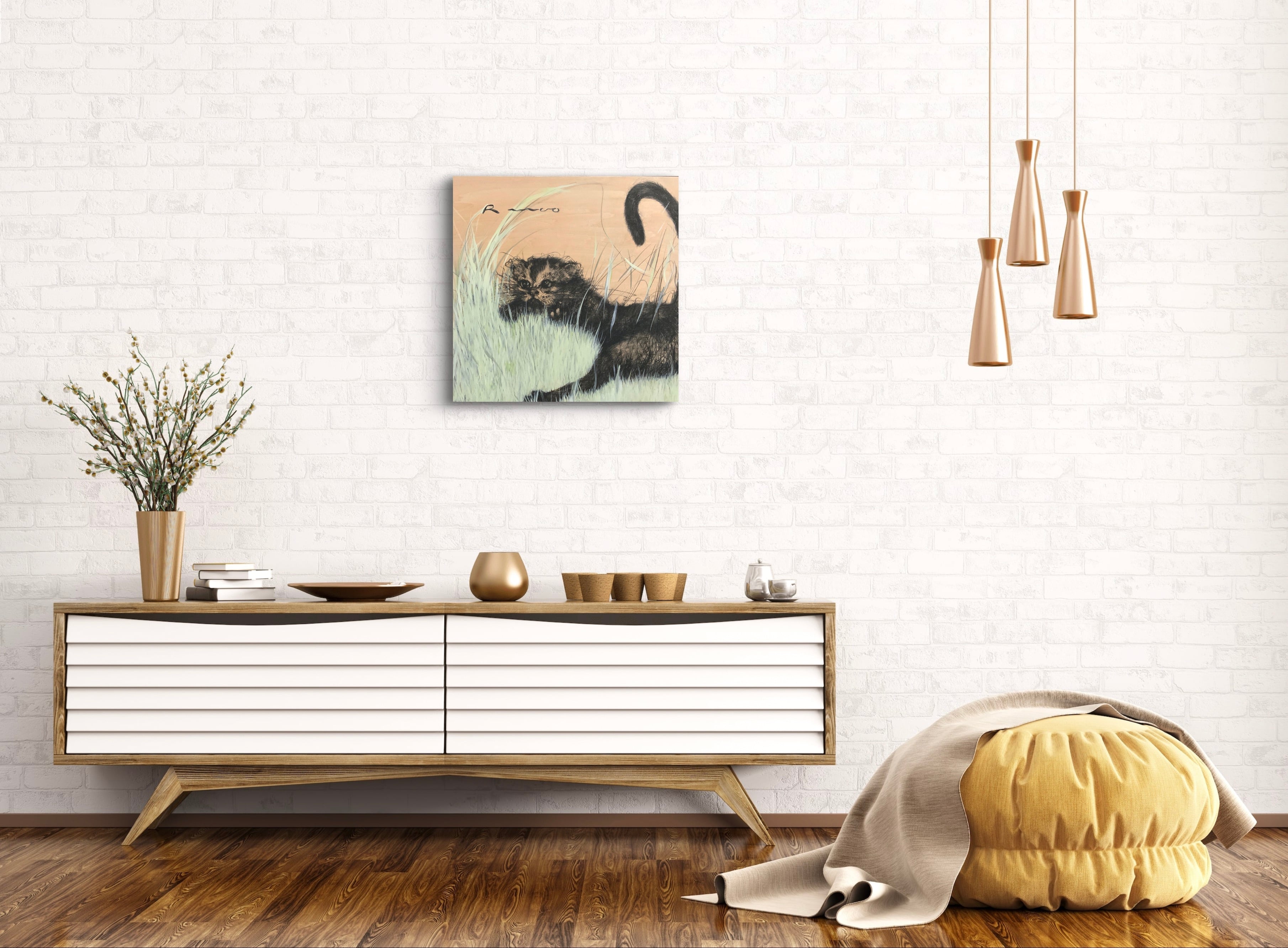 木炭とアクリル絵の具で描かれた猫