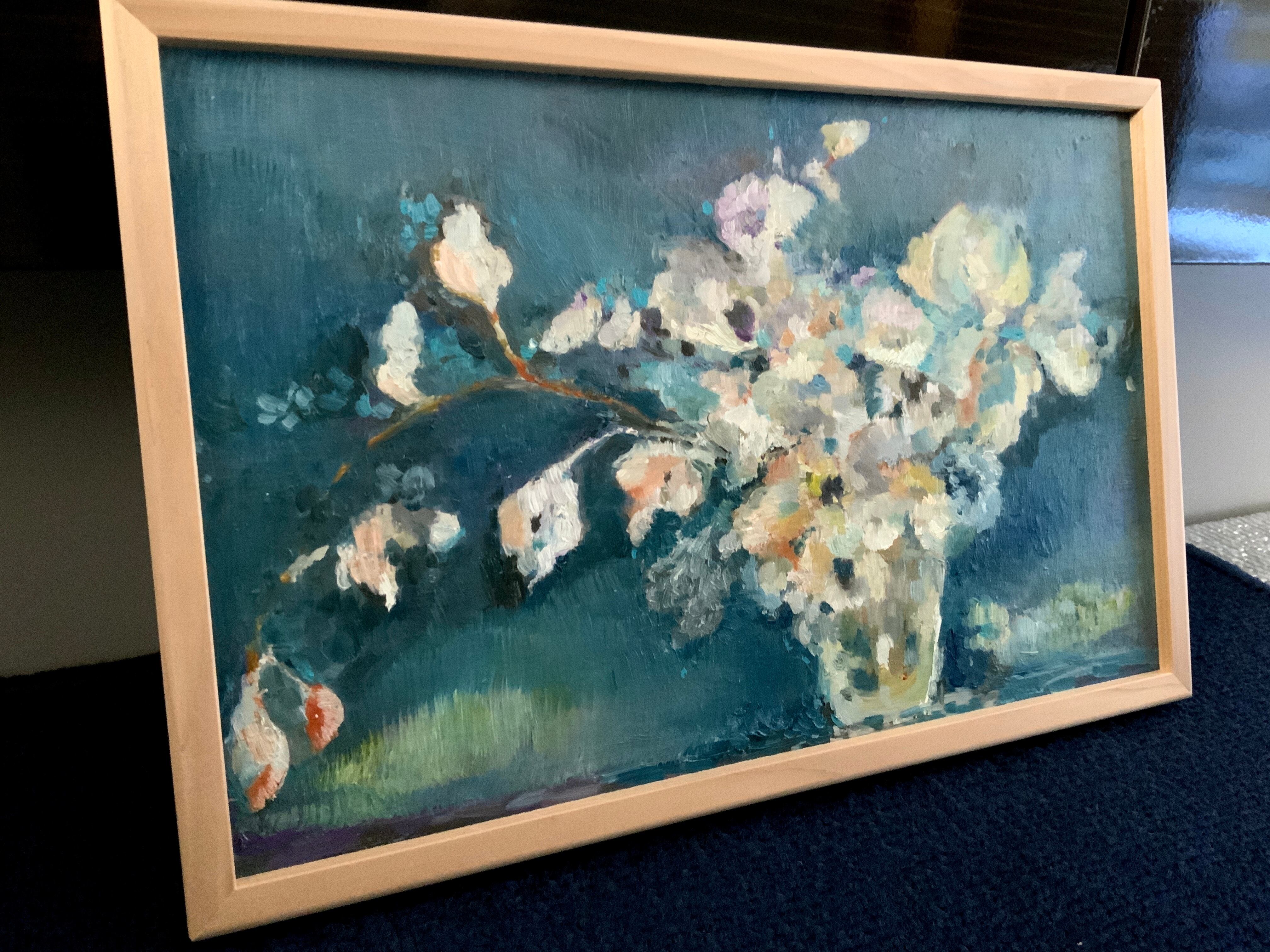 板に油絵具 額は白木の青森ヒバ